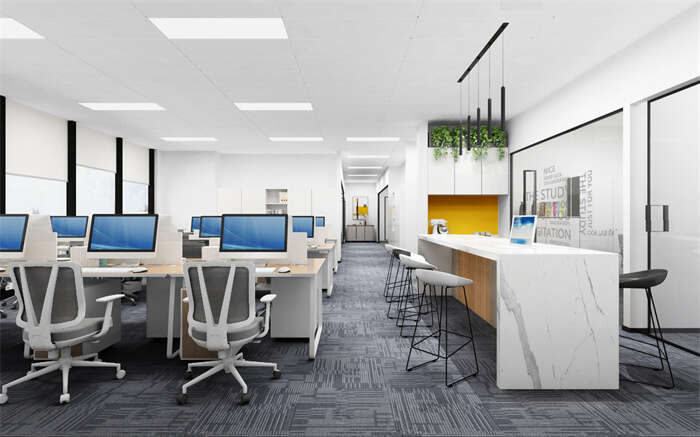 另一方面因?yàn)閱T工對(duì)于光線的遮擋會(huì)使室內(nèi)采光減弱,這樣空間就會(huì)看上去相對(duì)陰暗狹小。所以工位盡量側(cè)邊靠窗,使員工能夠側(cè)面面光,一方面提升了員工舒適度,另一方面因?yàn)檗k公區(qū)之間的過道,光線不會(huì)被遮擋,室內(nèi)采光會(huì)更好,從而使空間敞亮,空間感提升。然而又到了不得不說的光線不足的時(shí)候,此時(shí)我們需要用到燈具進(jìn)行采光,為了避免占用地面和桌面空間,應(yīng)盡量減少使用落地?zé)艉妥烂鏌艄?,轉(zhuǎn)而使用平板吊線燈或者是筒燈,這樣不僅光照度更強(qiáng),而且也節(jié)約了成本。