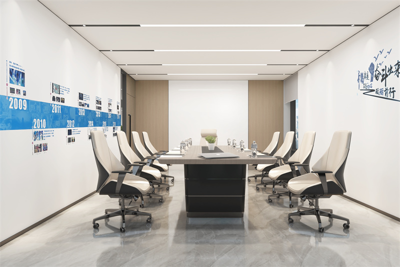 其次是會議室及洽談室這一類的獨立功能性區(qū)域,不僅需要考慮功能性照明,也許需要將空間的氛圍體現(xiàn)出來。比如使用內(nèi)嵌的線條燈和在其兩邊布置射燈突出會議室嚴(yán)肅的氣氛;使用線條燈和筒燈做一些造型用來使洽談室和茶水室氣氛活躍;