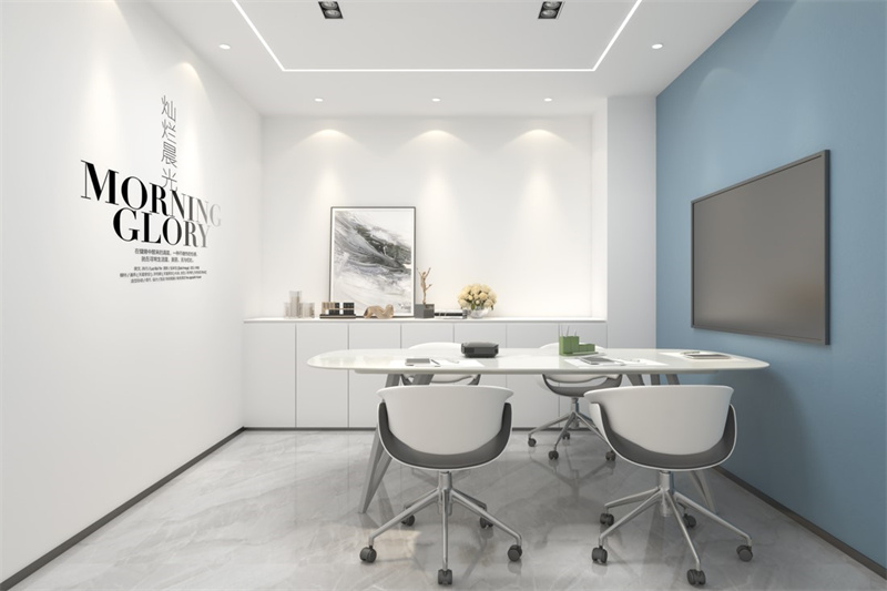 墻面單層涂料:墻面涂料大多是指乳膠漆,在辦公室裝修中是使用最廣的一種,其施工簡單、易于調(diào)色、造價便宜,能夠使辦公室產(chǎn)生整體感,且突出空間明亮、寬敞,是被大眾廣泛接受且使用的辦公室裝修設(shè)計材料。但因為其裝飾性較低、變化不多的局限性,所以在進(jìn)行辦公室裝修時,可以選擇在墻面上做一些掛畫裝飾,并配以射燈。墻面素雅、燈光點綴,在光線映照的柔和陰影里,可以提升辦公室的簡約舒適感。