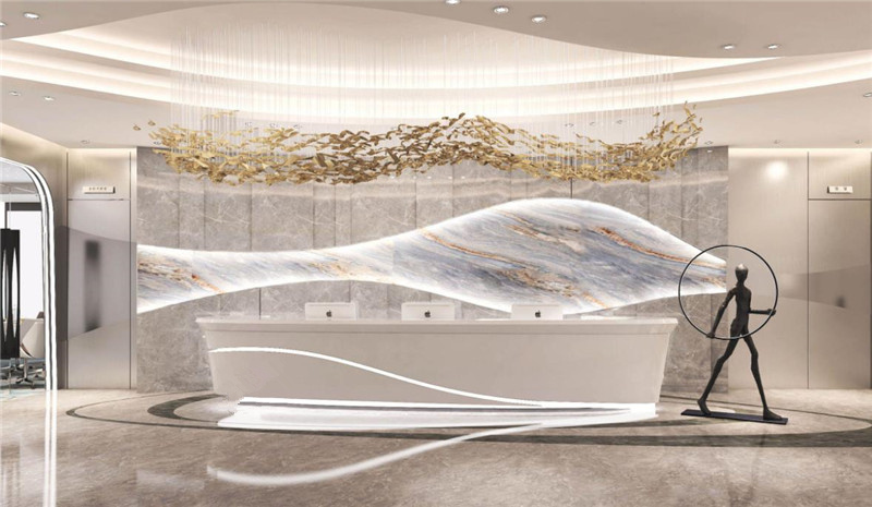 其次要注意功能性設(shè)施的重要性,企業(yè)形象墻與接待臺一般會設(shè)計在同一個地方,位置會選擇在前廳比較顯眼處,大門到接待臺的視覺范圍要寬廣,但距離不要太遠(yuǎn)??梢栽O(shè)計布置等候區(qū)、會客區(qū)或散座,再者在地面或吊頂處使其與其它空間有所區(qū)分,但不要阻隔。